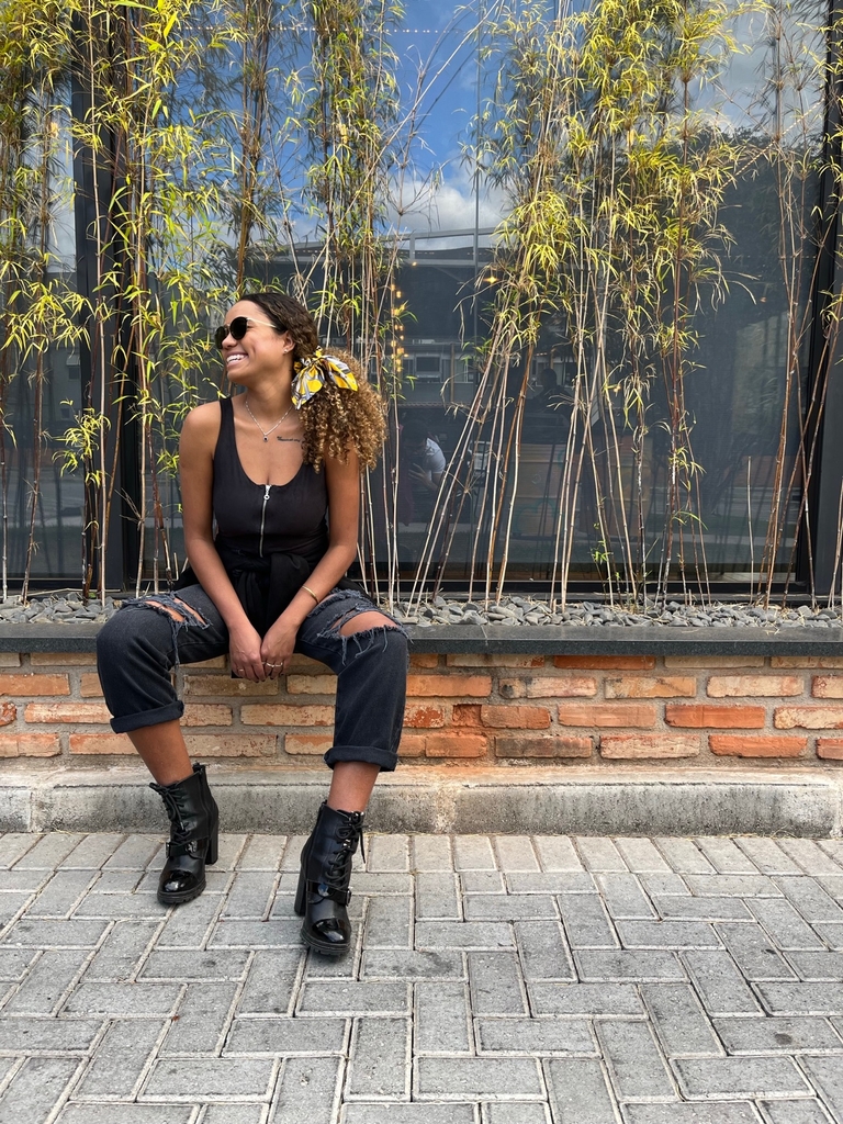 Black Jeans autêntico e moderno possui modelagem mom, cintura alta, parte frontal destroyed e cinto no mesmo tecido.